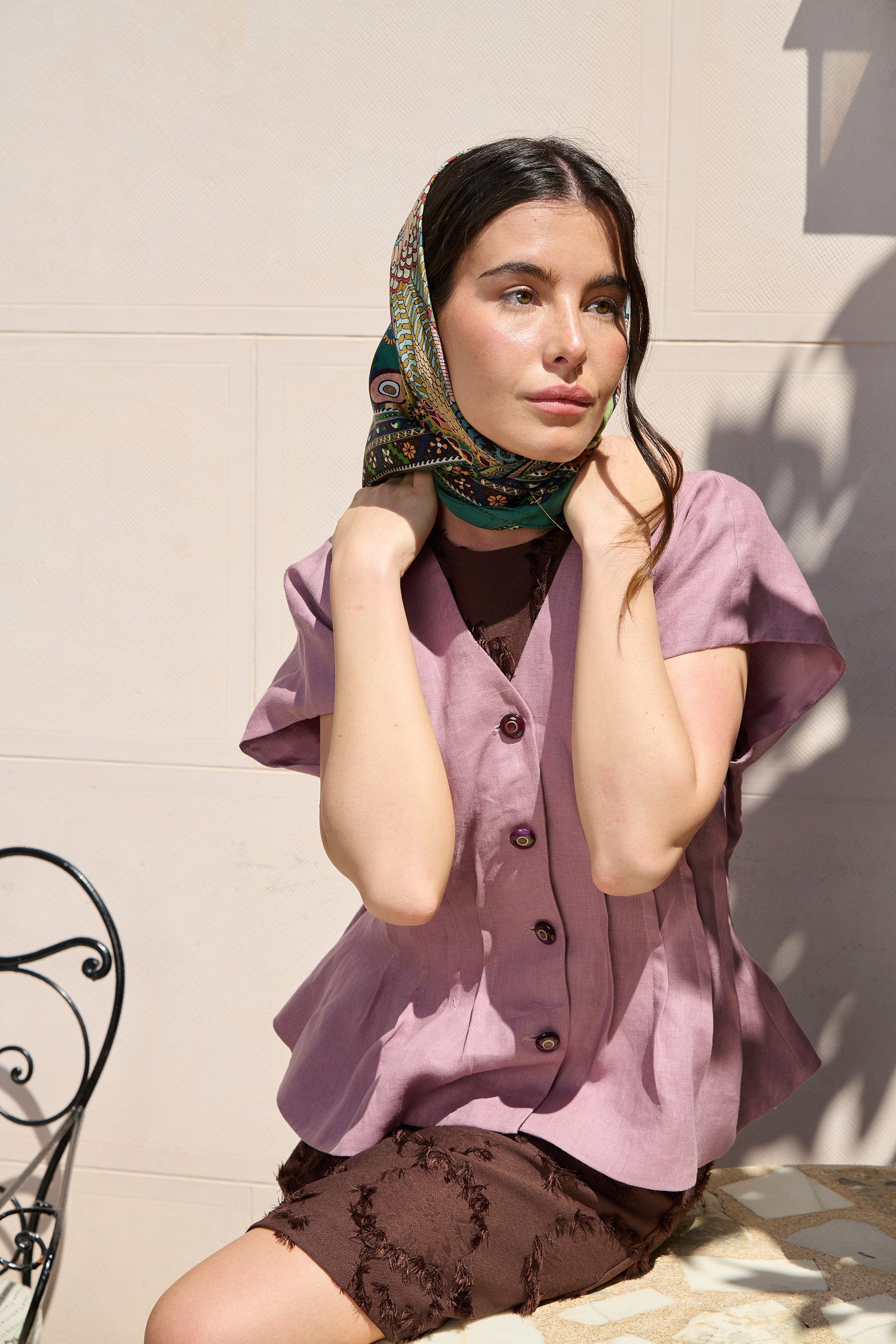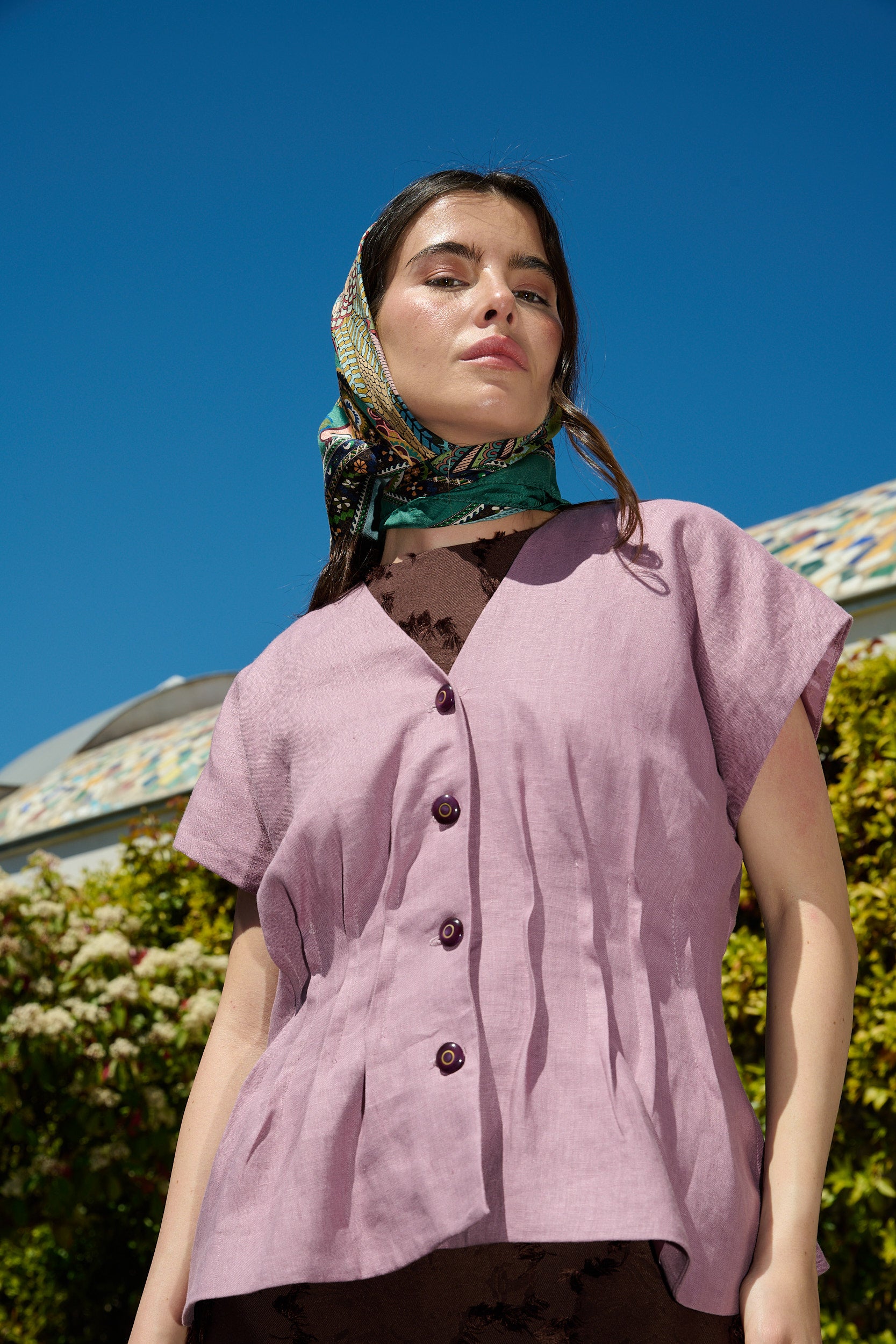 Nuestra chaqueta LAUREL combina la delicadeza y frescura confeccionada con lino de color lavanda, diseñada para realzar la silueta con naturalidad. Las pinzas verticales al frente aportan estructura y un movimiento suave, mientras que la botonadura central con botones oscuros añade un contraste sutil y elegante. Con mangas cortas tipo kimono y escote en V, esta pieza evoca una estética relajada pero cuidada, perfecta para el entretiempo o los días de verano.